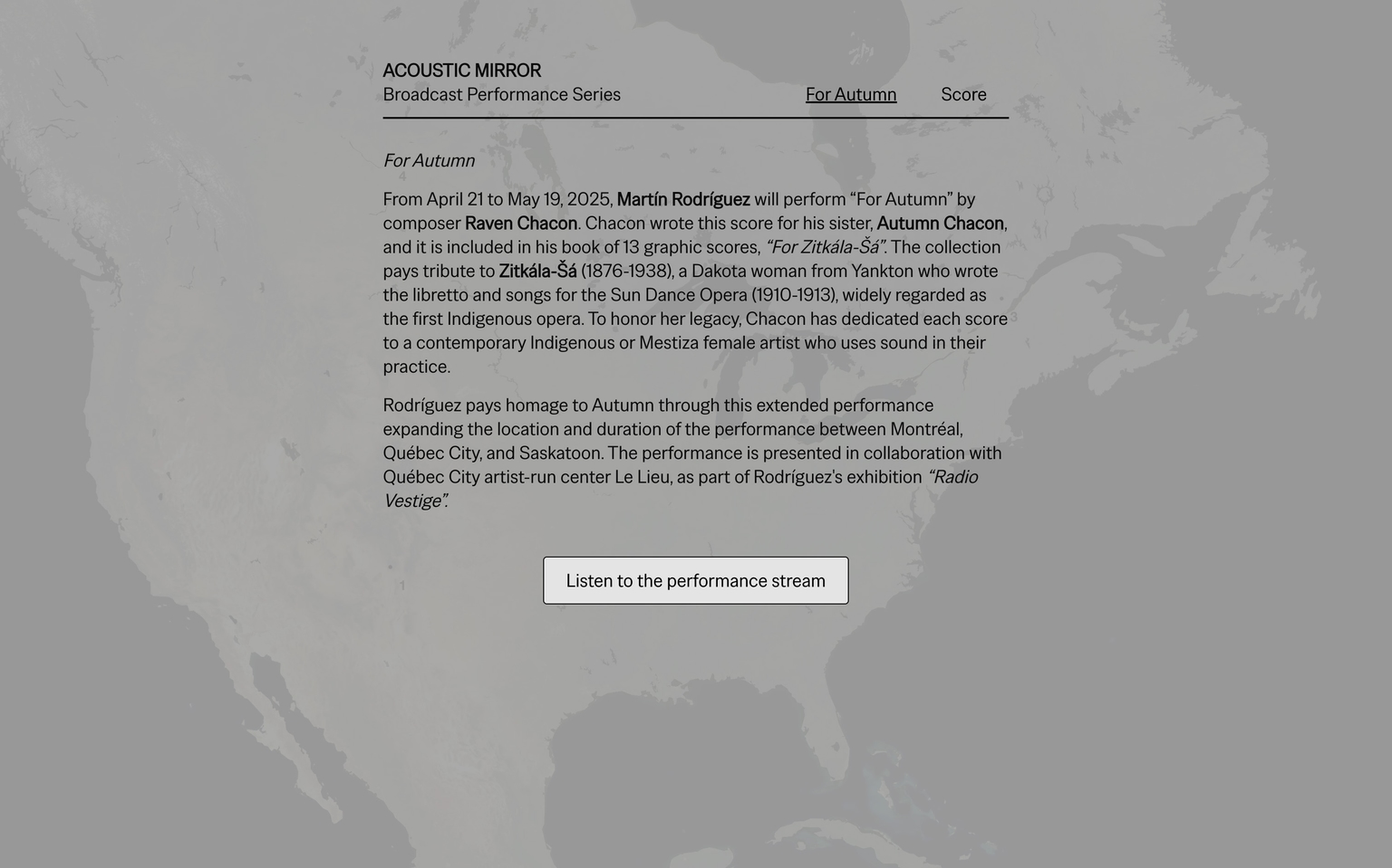 Rodríguez paid homage to Autumn through an extended performance expanding the location and duration of the performance between Montréal, Québec City, and Saskatoon. The performance was presented in collaboration with Québec City artist-run center Le Lieu, as part of Rodríguez's exhibition “Radio Vestige”.